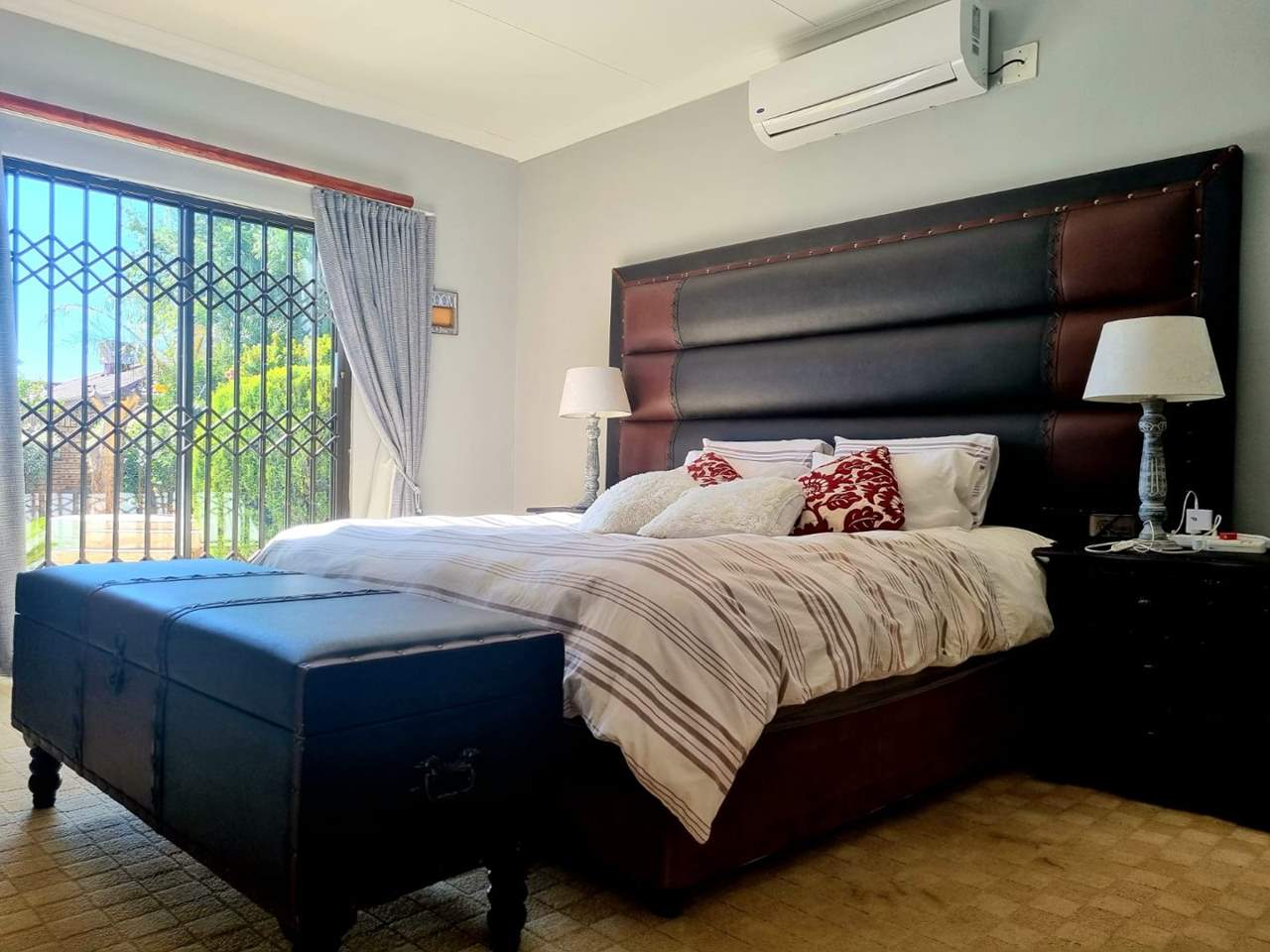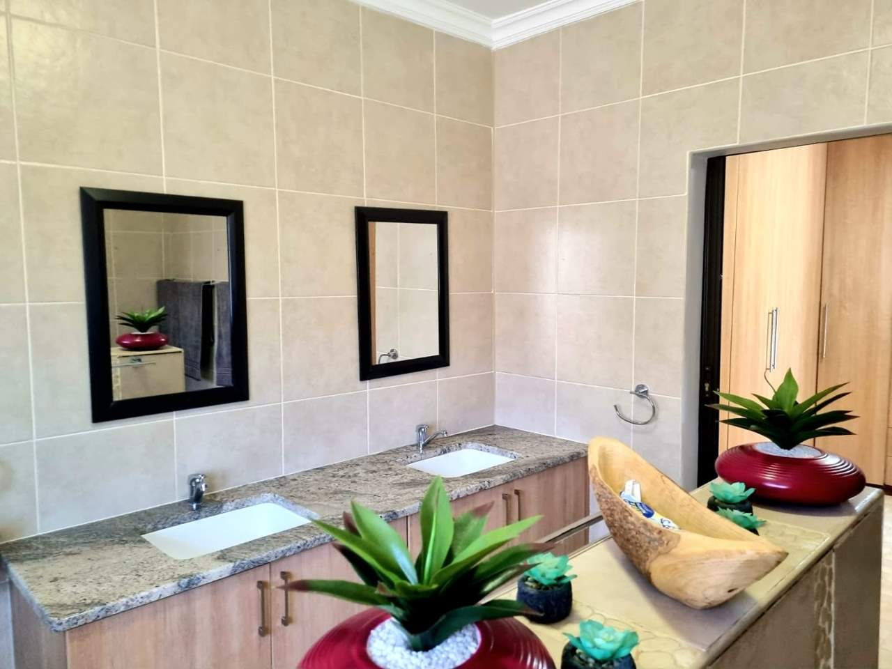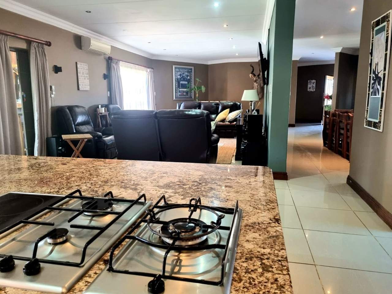 Three bedrooms (all with built-in cupboards, underfloor heating, and aircon). The main Bedroom has a walk-in closet and a spacious relaxation room that leads to the swimming pool. It further includes two Bathrooms (one main en suit), an open plan Kitchen (with granite tops, built-in cupboards, pantry, eye-level oven, gas hob, and scullery), open plan Lounge (with aircon), open plan Dining room, and a Study.