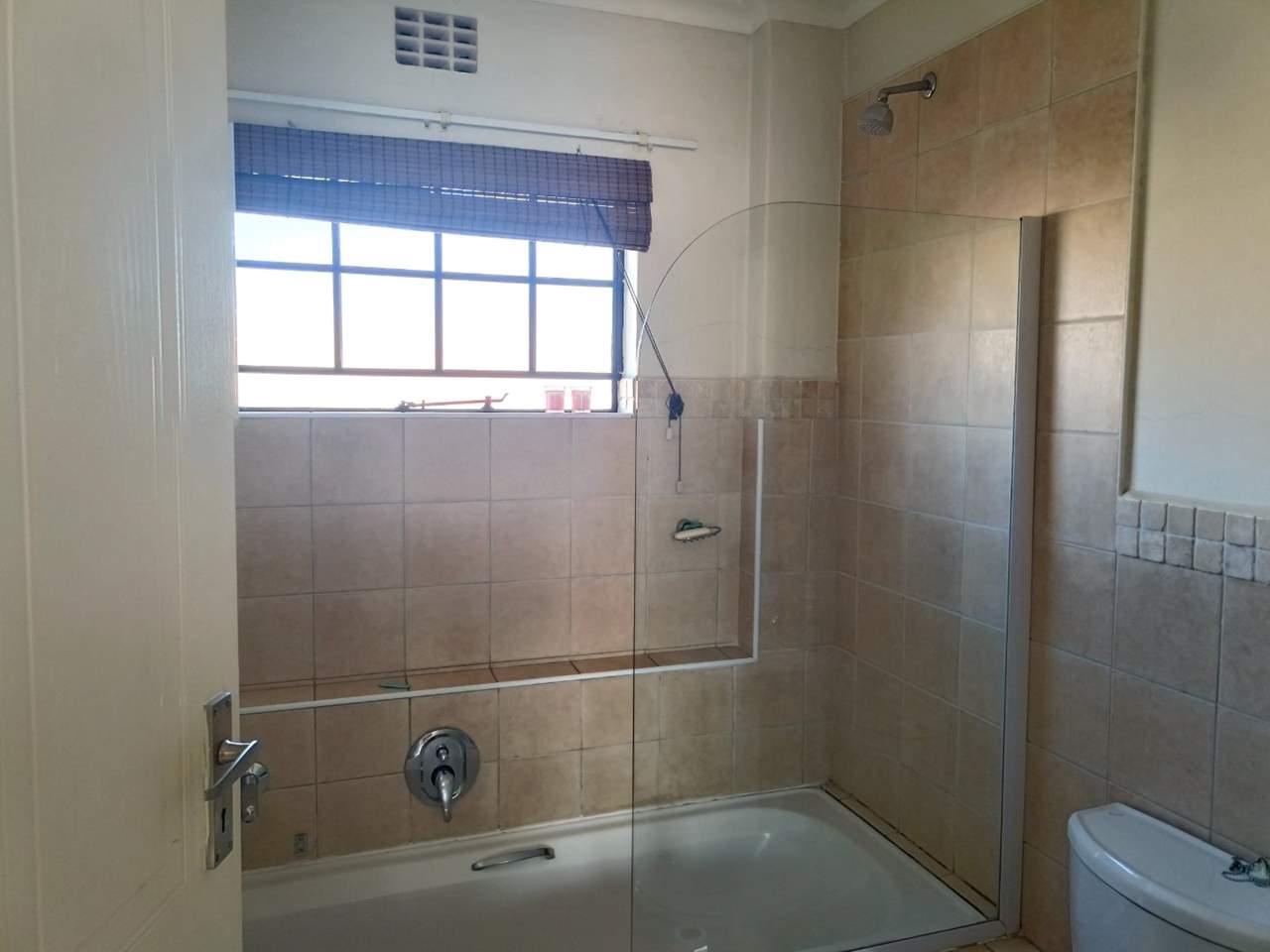 Full Family Bathroom:?A neat, tiled bathroom featuring a versatile bath-shower combination with a glass splash screen.