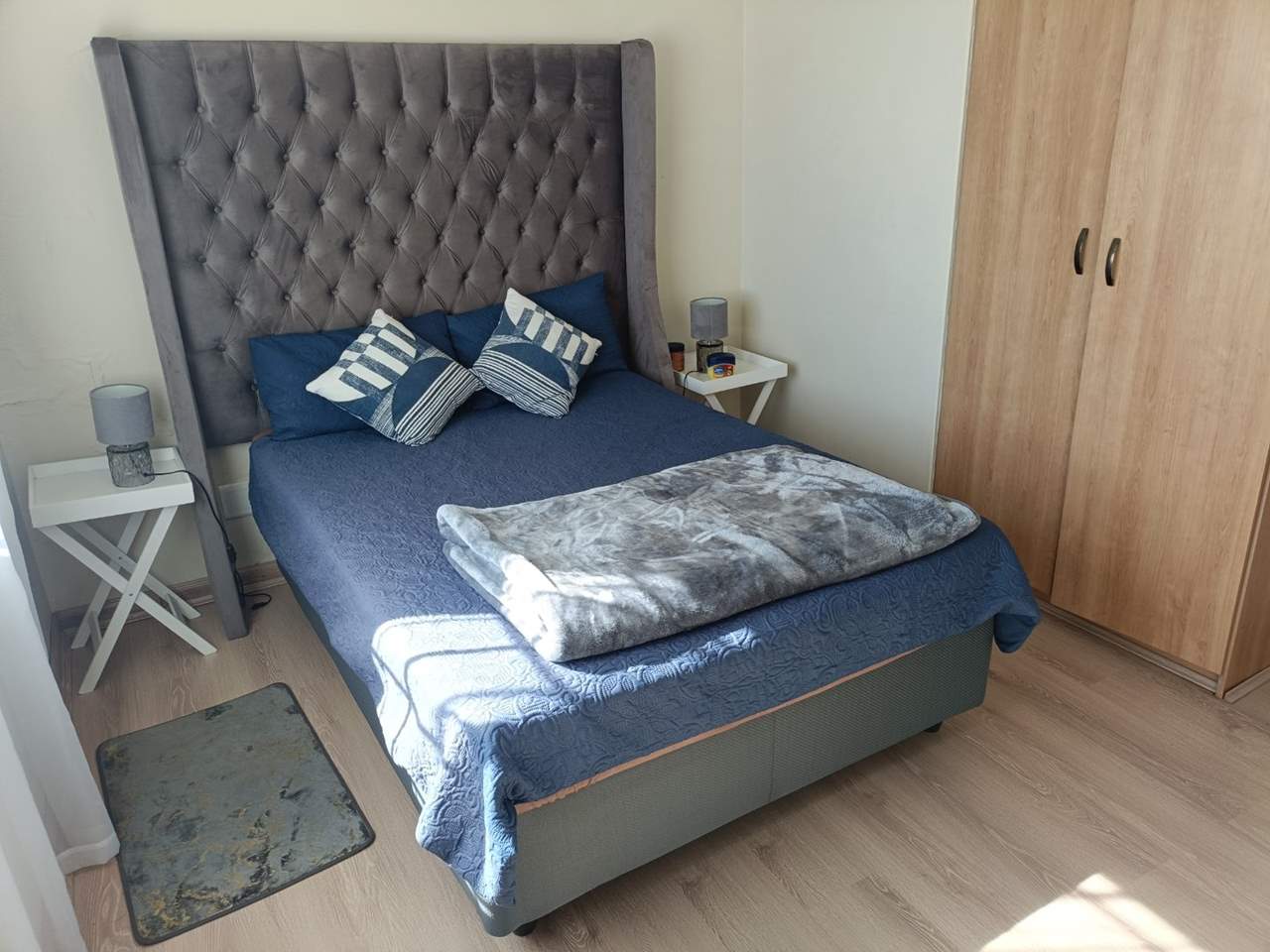 2 Comfortable Bedrooms:?Both bedrooms feature built-in cupboards and wood-textured flooring. The primary suite is impressively sized, comfortably fitting a king-sized bed with a statement headboard.