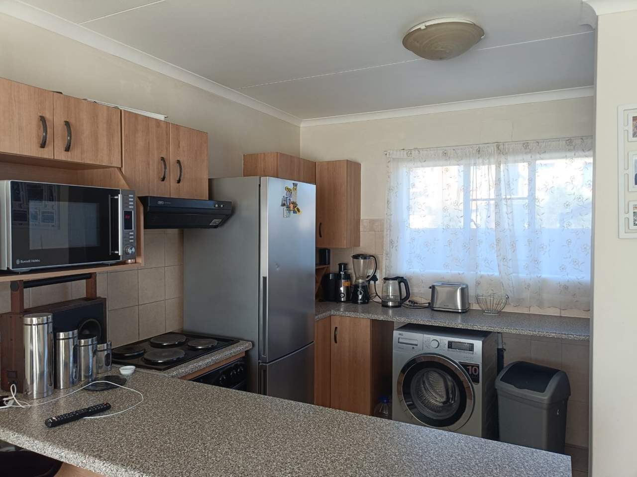 Modern Kitchen:?A functional workspace featuring sleek granite-style countertops, ample cabinetry, and a convenient breakfast bar. The kitchen is equipped with a built-in hob and oven and has designated space for a fridge and washing machine.