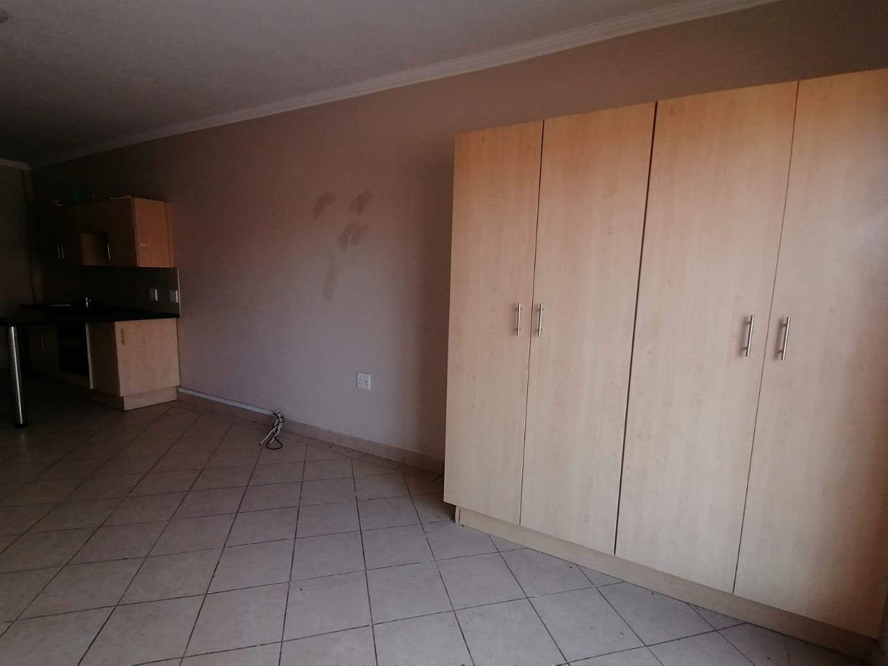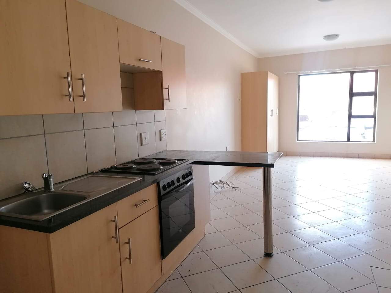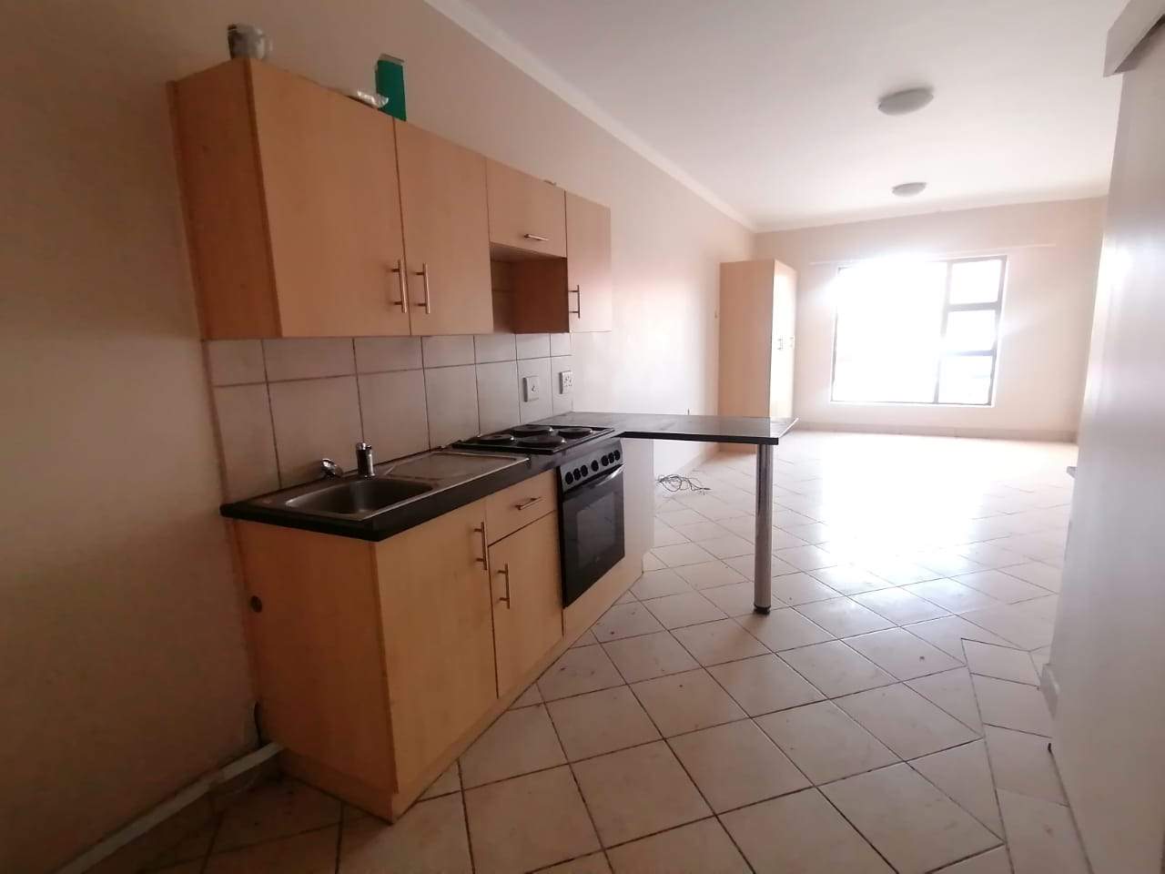 The unit offers a spacious open plan setup, that includes a bedroom/lounge area with a kitchen that includes a built-in stove & oven.