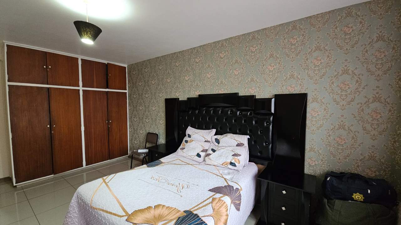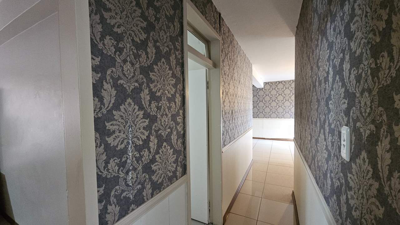 The expansive open-plan lounge and dining area creates a warm and inviting atmosphere, enhanced by striking feature wallpaper that adds character and charm. The main bedroom is generously sized with ample built-in cupboards, while the second bedroom is well-proportioned and versatile, perfect for guests, a child’s room, or a home office.