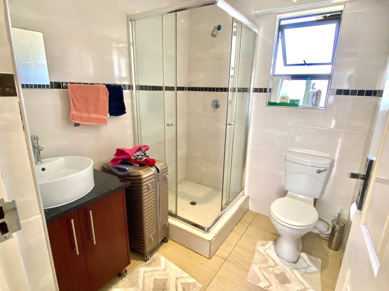 • Guest Bathroom: Tiled floors, shower, toilet, and basin
