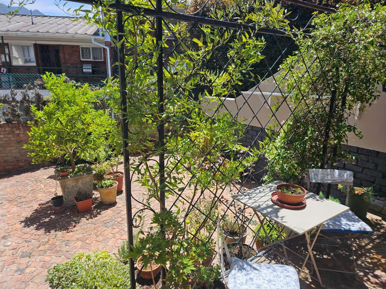 The secluded garden on the sunny north side is filled with lush flowers and plants.