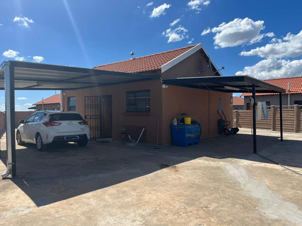 With spacious bedrooms, two well-appointed bathrooms each fitted with a shower, basin, and toilet, as well as an open-plan kitchen that flows into a generous dining area and lounge. The property includes two shaded carports, a cosy Lapa for outdoor entertaining, and prepaid electricity for easy monthly budgeting.