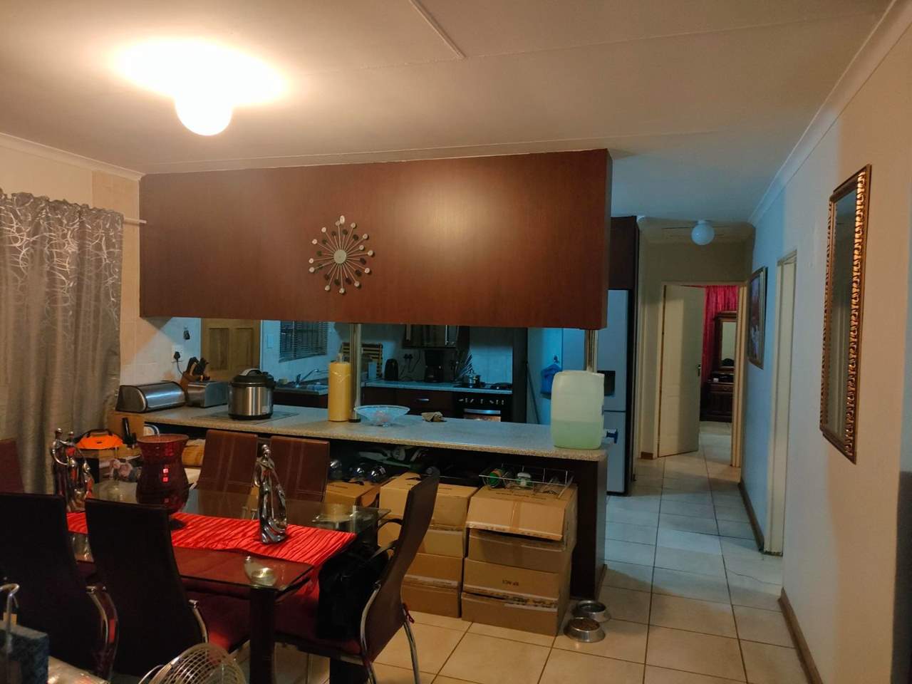 3 Bedrooms with built in cupboards, 2 Bathrooms, one is main en suite, Open plan lounge and dining area with a well equipped kitchen with breakfast nook.